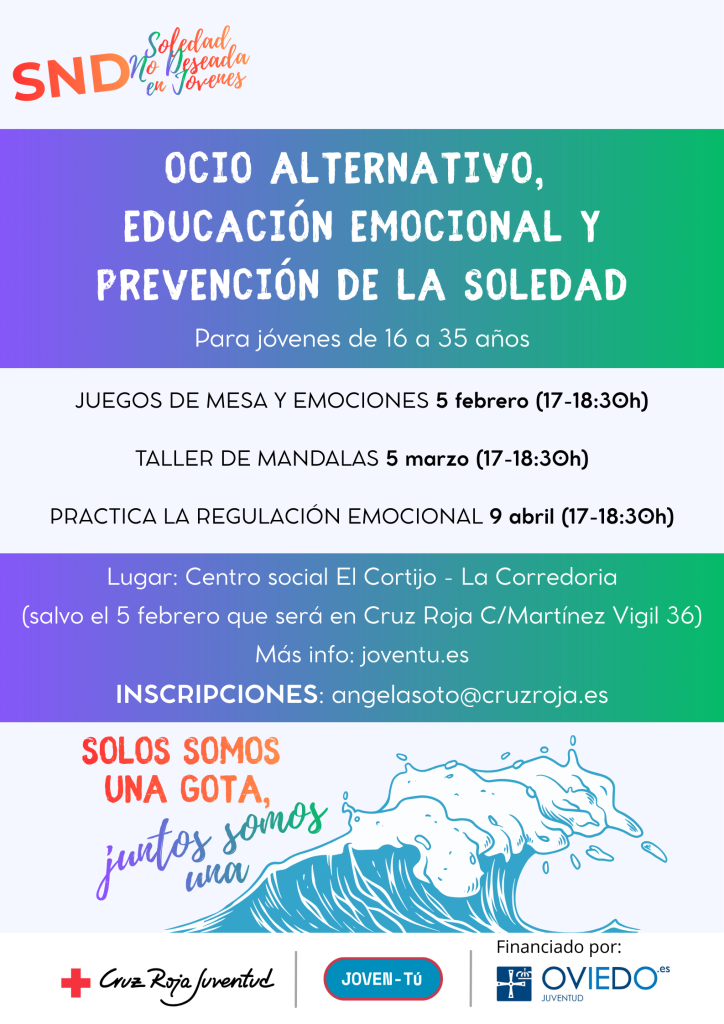 Desde el proyecto Soledad no deseada en jóvenes realizaremos actividades dirigidas a la población adolescente y joven (de 16 a 35 años) cuyo objetivo es ofrecer actividades de ocio alternativo y educación emocional. Se programará una actividad mensual en horario de mañana durante los meses de verano y en horario de tarde durante el periodo lectivo de 2025.